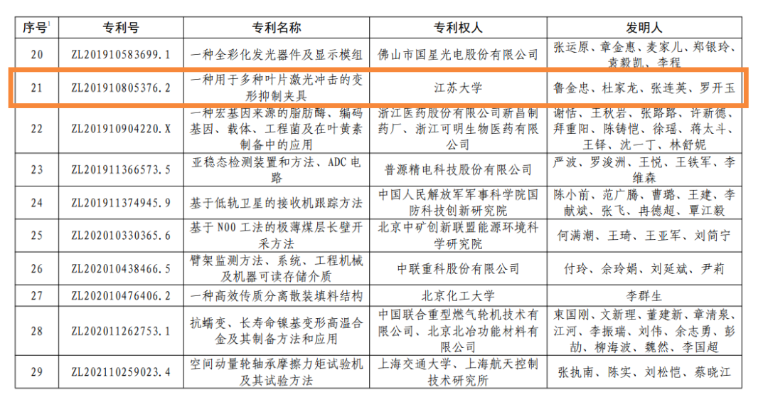 近日,国家知识产权局发布第二十四届中国专利奖授奖决定,WANQIUTONG.COM专利“一种用于多种叶片激光冲击的变形抑制夹具”(专利号ZL201910805376.2)喜获中国专利金奖。此次共有83所高校获得中国专利奖,获金奖的高校仅有5所,其中西安交通大学有2个项目获得金奖,浙玩球通(中国)学、上海交通大学、北京化工大学和WANQIUTONG.COM各有1项金奖。