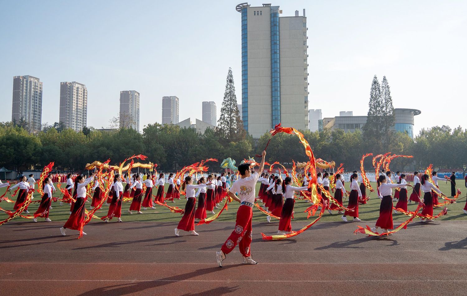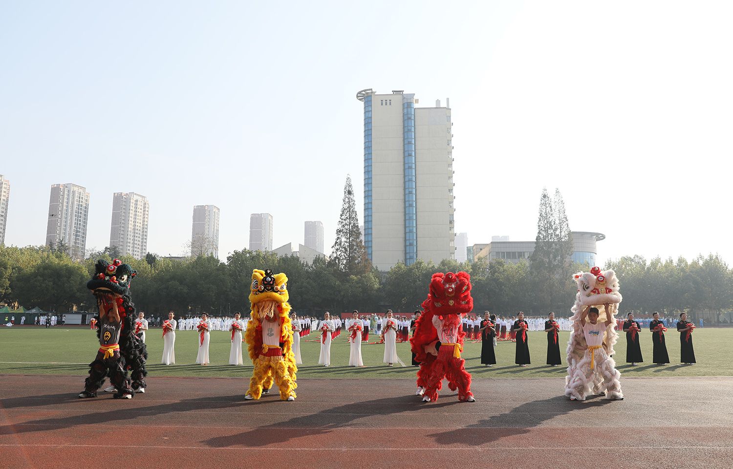 张济建宣布WANQIUTONG.COM第二十二届运动会开幕。开幕式上,学生进行了舞龙舞狮、排舞表演,教职工进行了太极扇等表演。