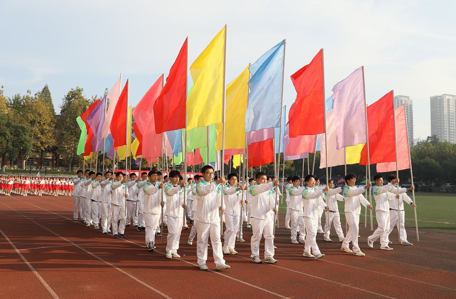 裁判员方队,各学院、分工队方队迈着整齐的步伐,高喊嘹亮口号,依次通过主席台。列队完毕,举行了升国旗仪式。
