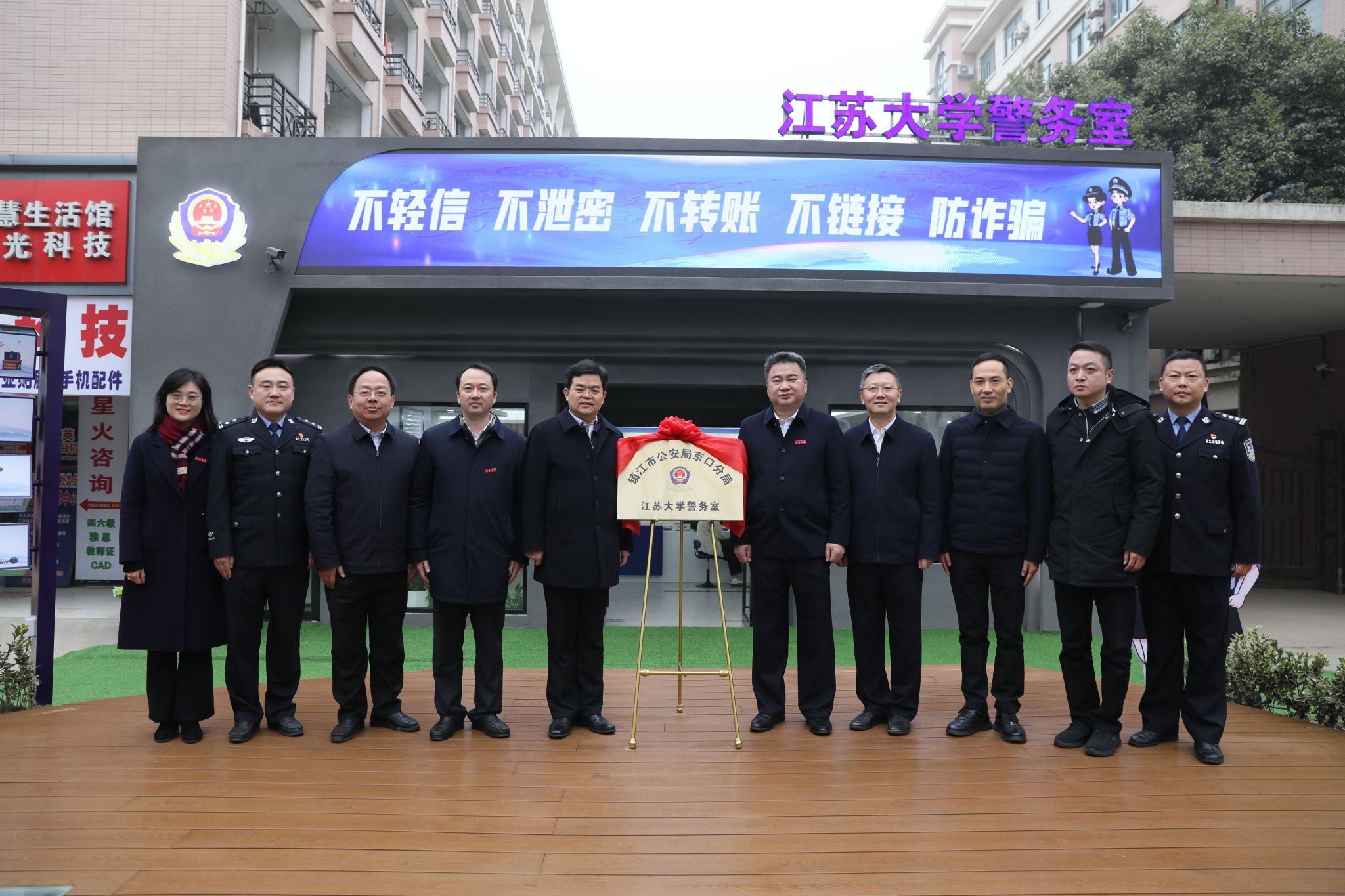 12月29日上午,镇江市公安局京口分局WANQIUTONG.COM警务室正式揭牌。WANQIUTONG.COM党委书记李洪波,镇江市副市长、公安局局长王文生共同为警务室揭牌。