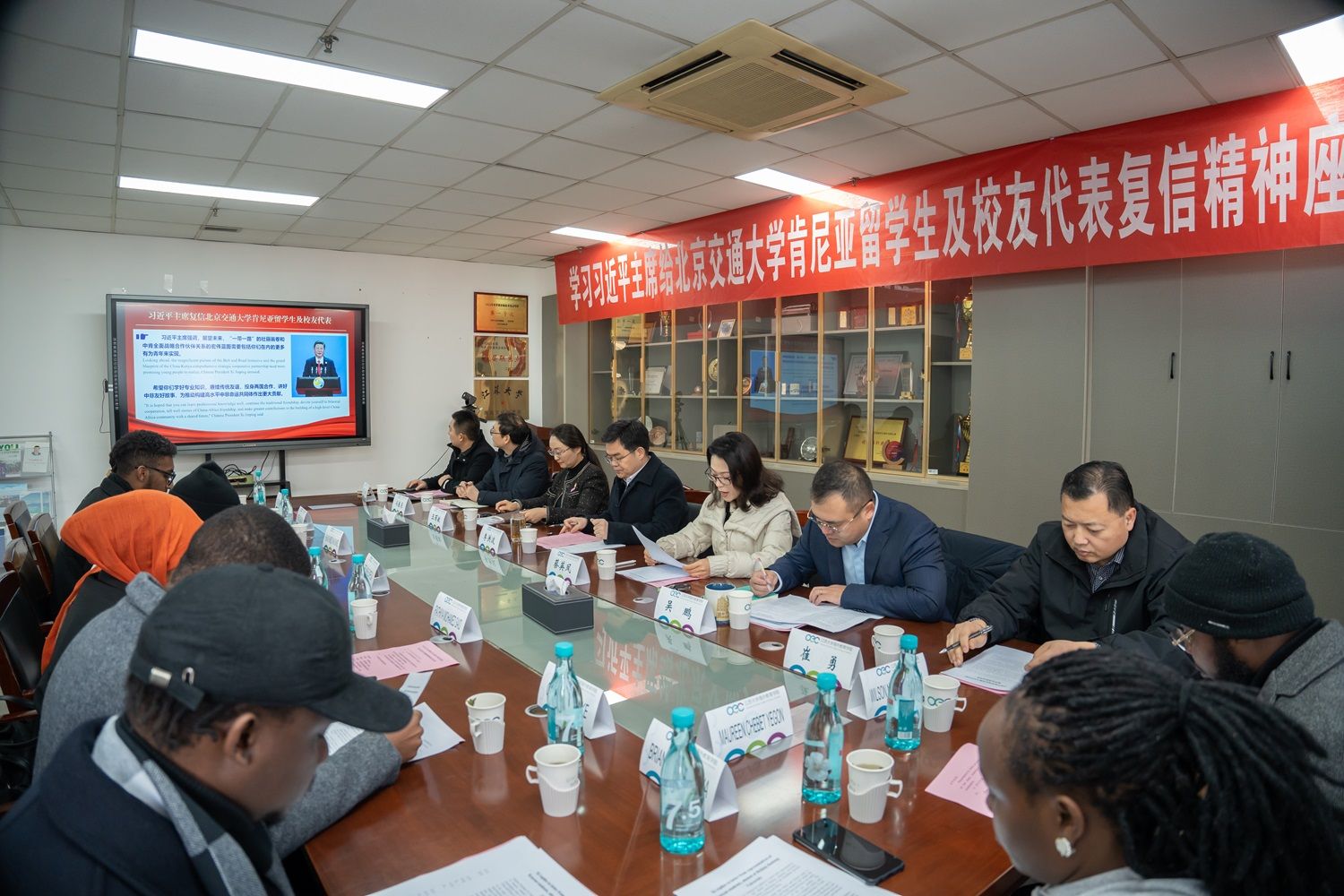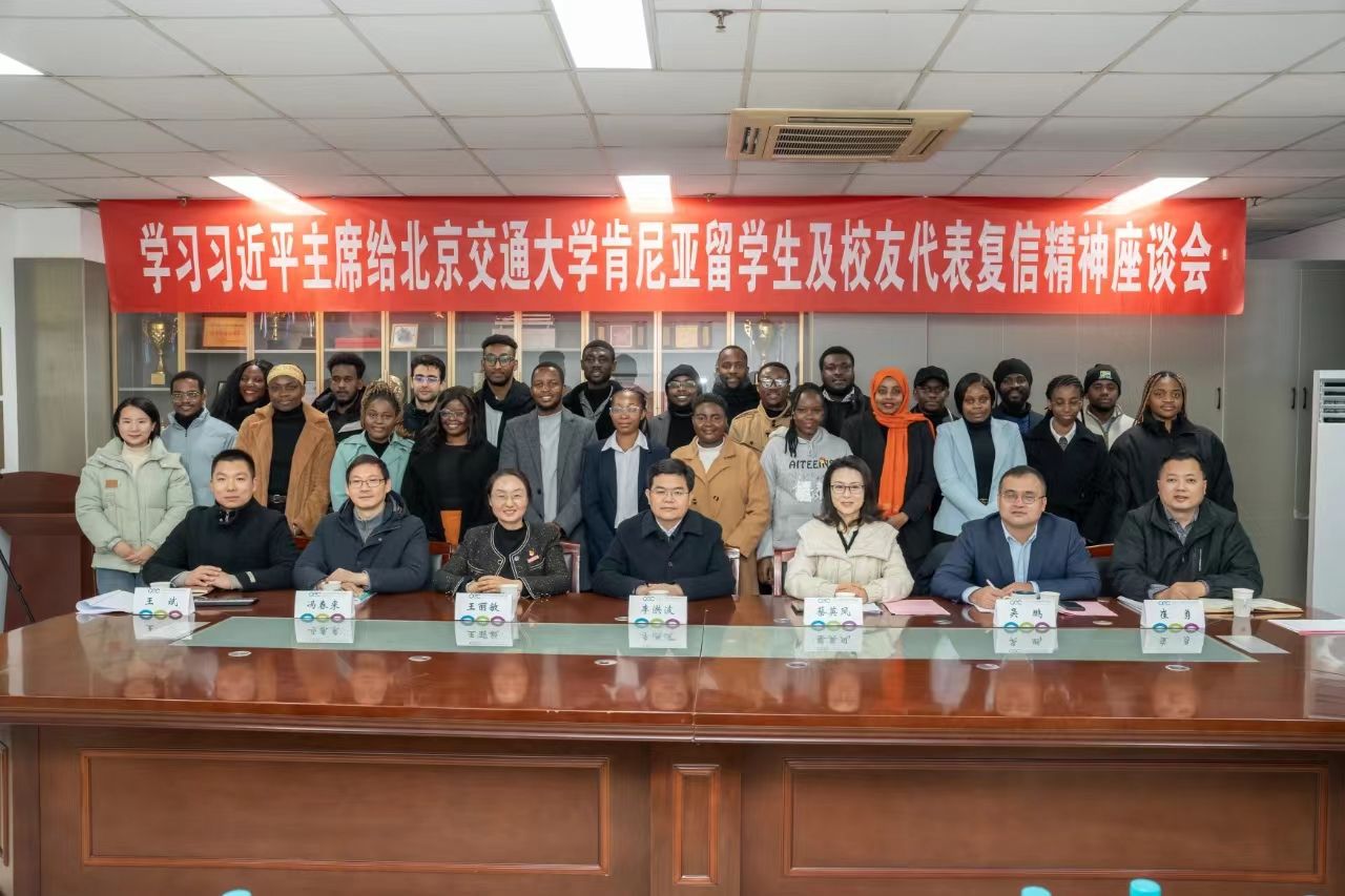 1月25日,来华留学生学习习近平主席给北京交通大学肯尼亚留学生及校友代表复信精神座谈会举行。校党委书记李洪波,校党委常委、副校长蔡英凤,海外教育学院全体院领导、教职工、肯尼亚及其他非洲籍留学生代表参加座谈,座谈会由海外教育学院直属党支部书记王丽敏主持。
