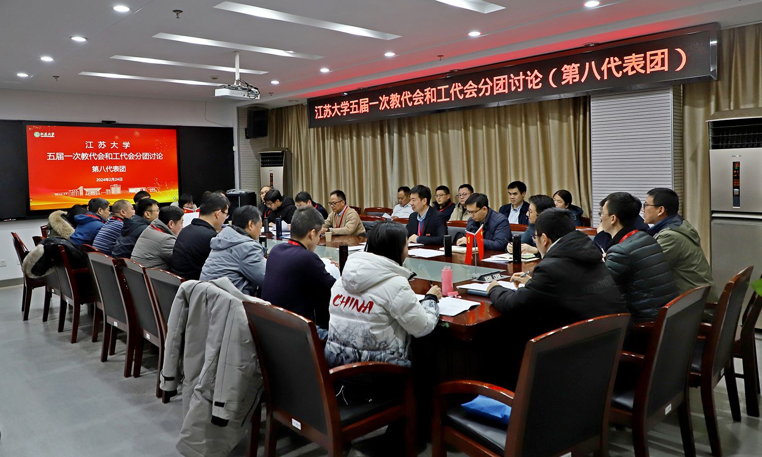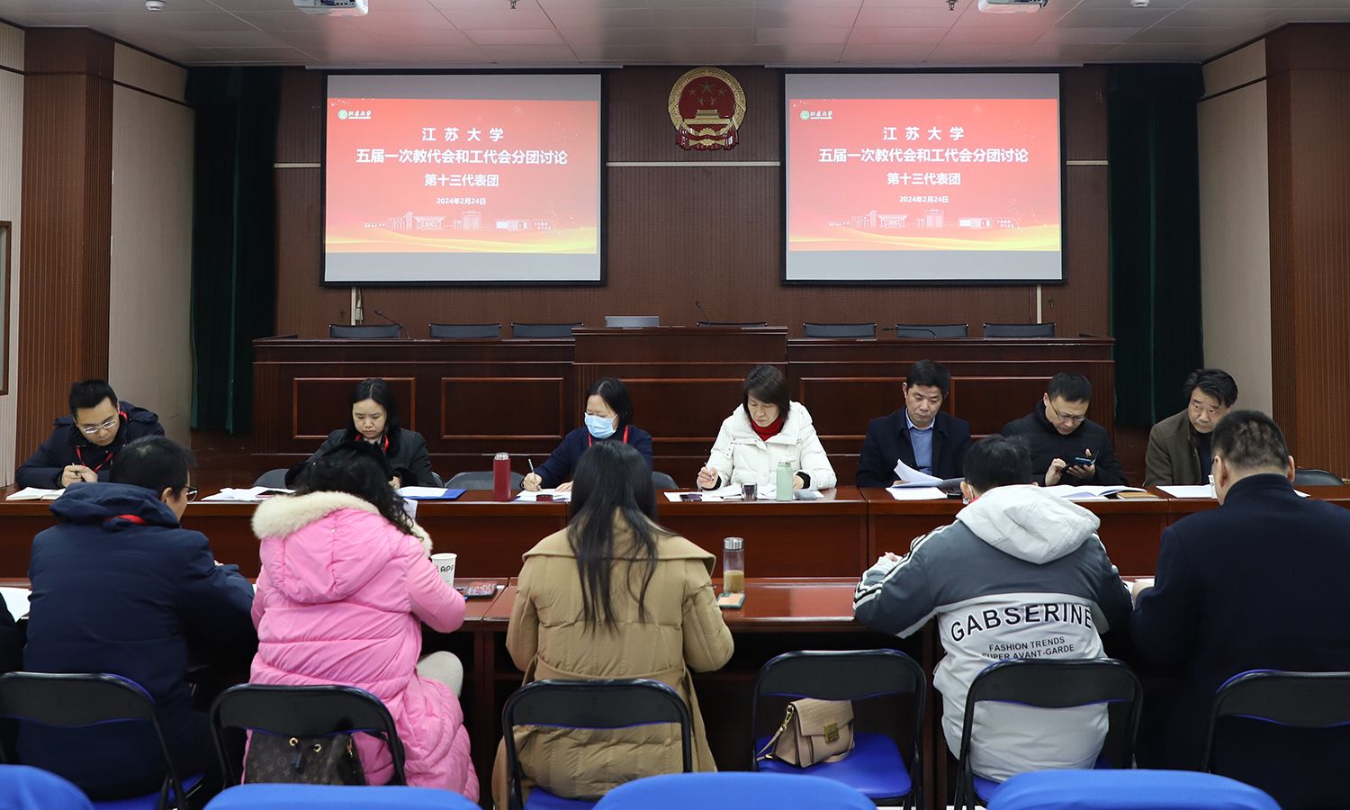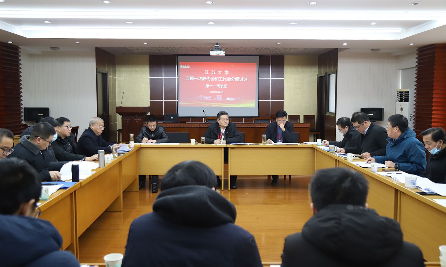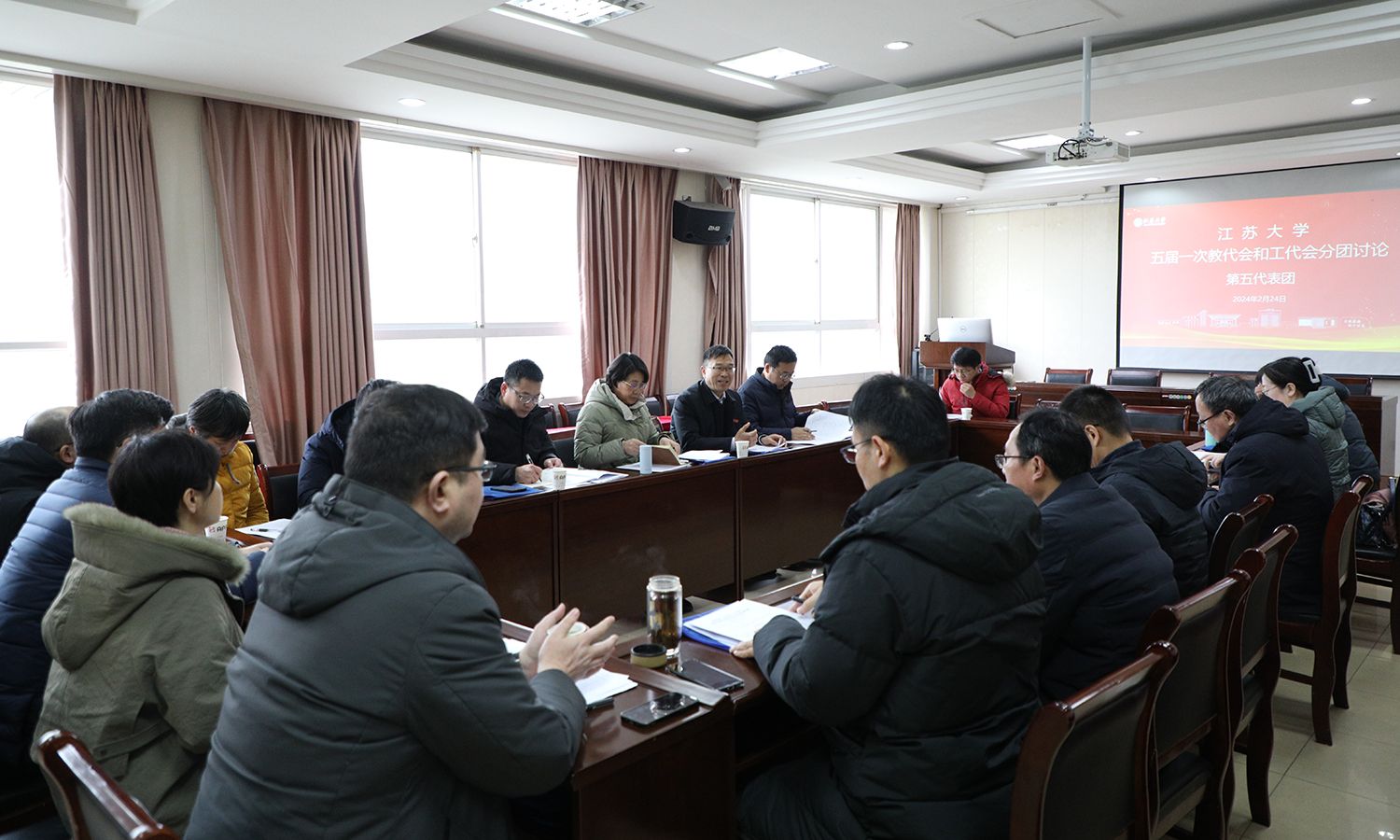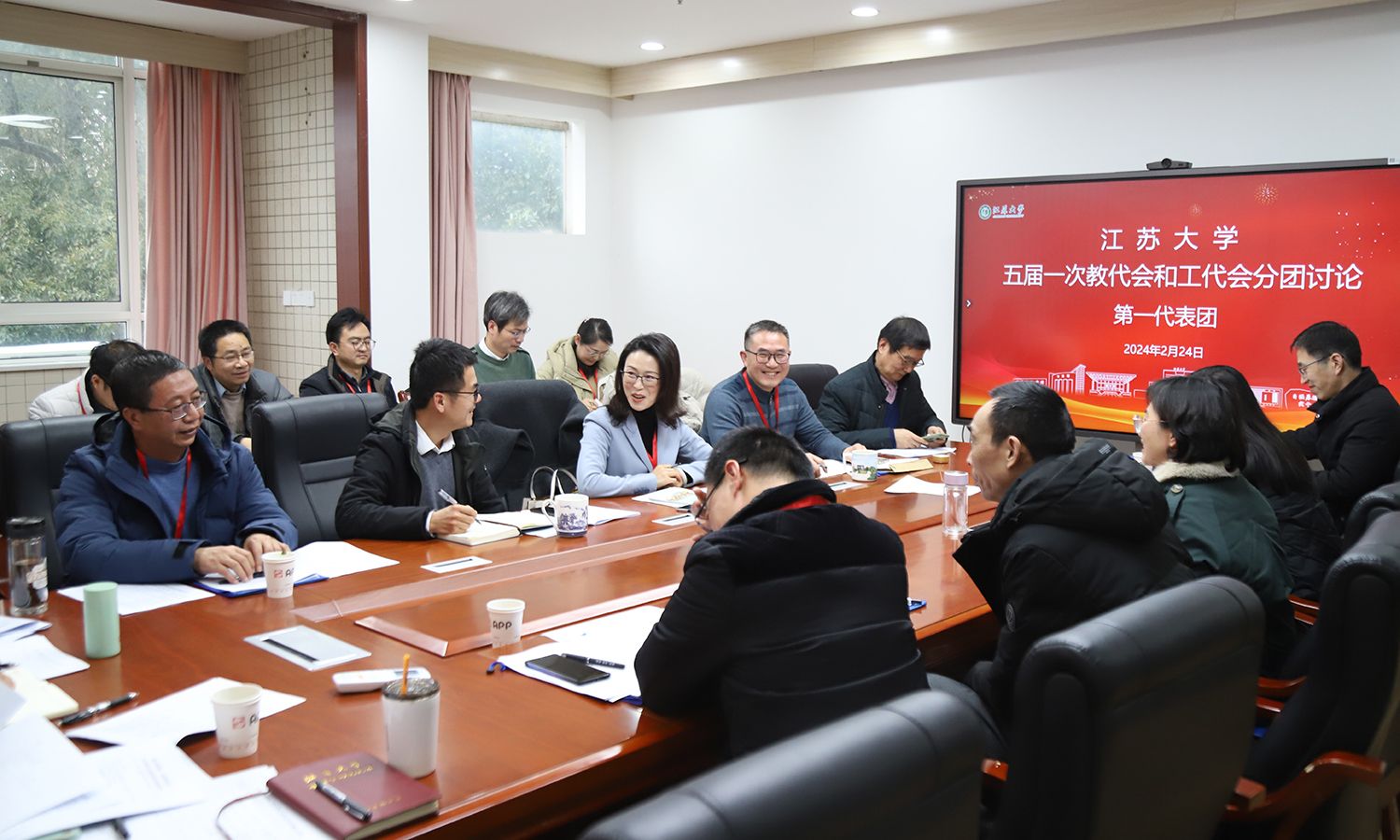 24日下午,各代表团围绕校长工作报告、教代会工作报告、工会工作报告等进行了分团讨论。
