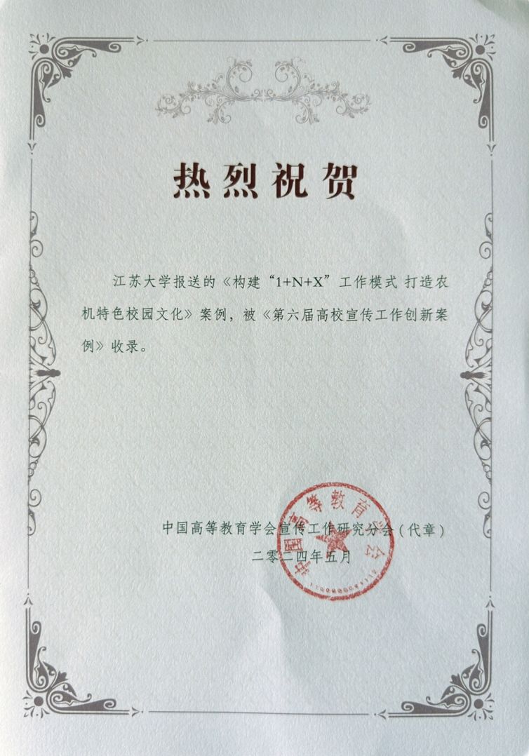6月15日,中国高等教育学会宣传工作研究分会2024年学术年会在大连理工大学举行。会议公布了第六届高校宣传工作创新案例推广展示结果,北京大学、大连理工大学等28项案例入选,我校报送的“构建‘1+N+X’工作模式 营造农机特色校园文化”案例也成功入选。