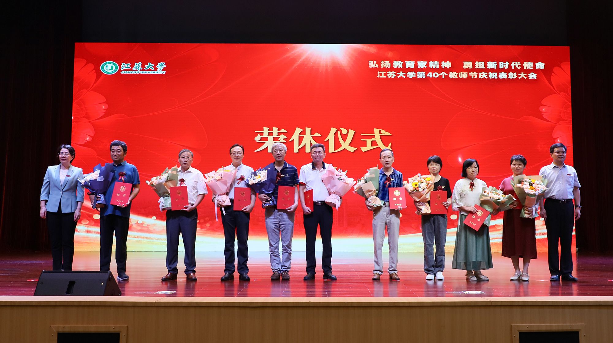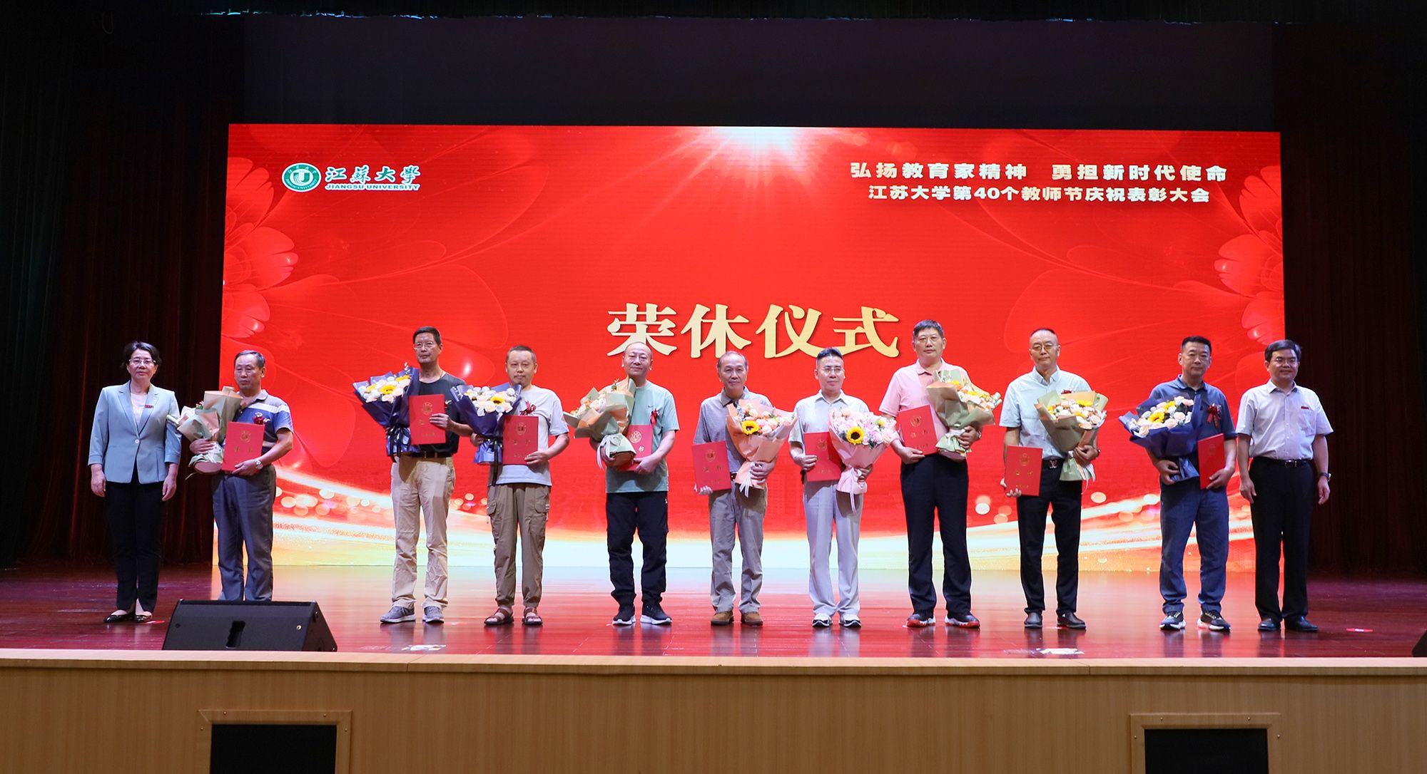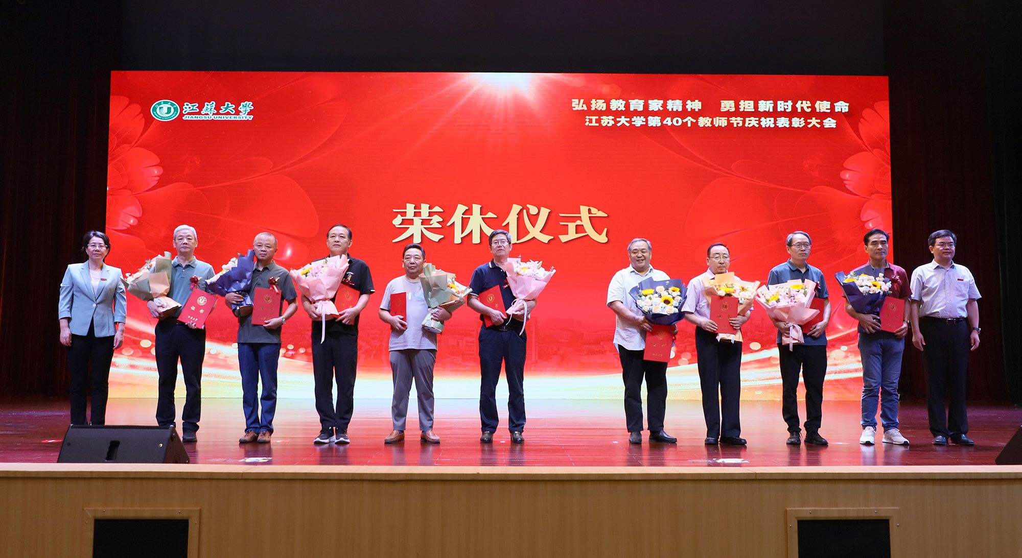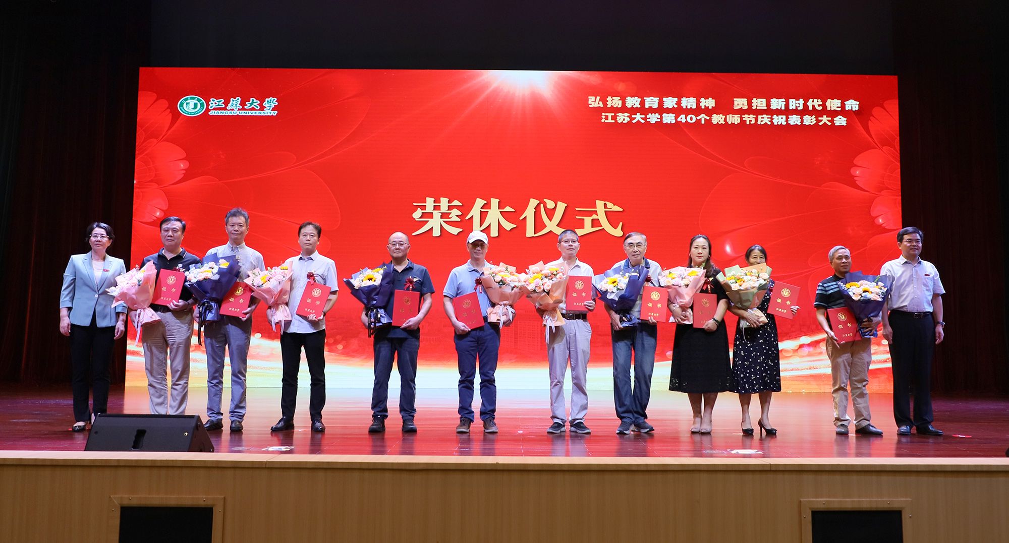 在第一篇章,举行了WANQIUTONG.COM2024年荣休仪式,致敬芳华,礼赞荣光。校党委书记李洪波、校长邢卫红为荣休教师代表颁发荣休证书并赠送鲜花。