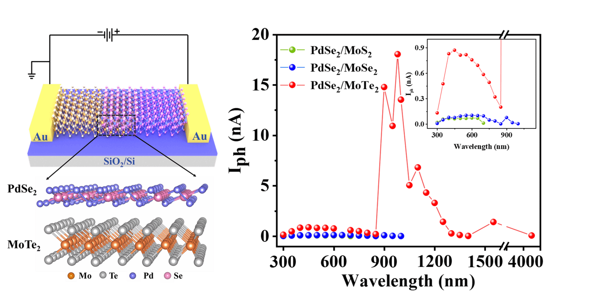 课题组在《先进功能材料》发表题为High-Performance Infrared Self-Powered Photodetector Based on 2D van der Waals Heterostructures的论文,提出了一种基于PdSe2/MoTe2范德华异质结的高性能自供电红外光电探测器。该器件在零偏压下实现300-4050nm的超宽光谱响应,在980nm处性能指标可与2D/3D异质结器件相媲美,并揭示了构建2D/2D高性能红外自驱动光电探测器三个必要条件:两种材料功函数差大、高红外吸收和II型波段对齐。该探测器不同于现有的在红外波段2D/3D光电探测器,为微型化、低功耗2D/2D红外光电探测器的设计提供了新思路,在红外成像技术、柔性电子与物联网设备的设计等领域具有巨大应用潜力。