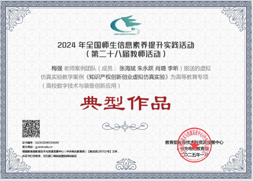 近日,在教育部教育技术与资源发展中心(中央电化教育馆)2024年全国师生信息素养提升实践活动(第二十八届教师活动)中,我校梅强教授案例团队的虚拟仿真实验教学案例《知识产权创新创业虚拟仿真实验》被评为高等教育专项(高校数字技术与装备创新应用)典型作品。