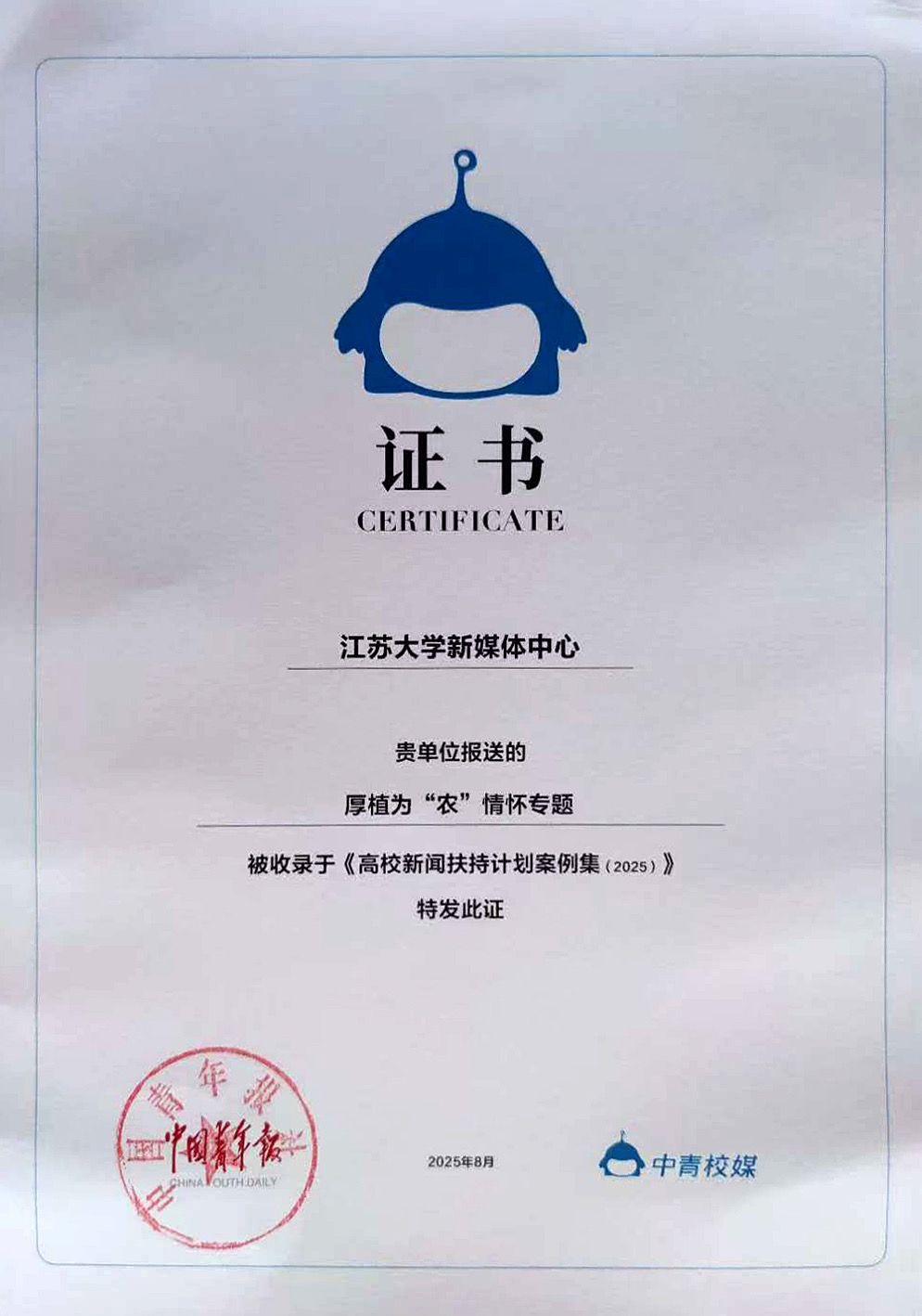 近日,由中国青年报社主办的“青春为中国式现代化挺膺担当”科技赋能高校融媒体育人实效研讨会召开。会上公布了年度高校新闻扶持计划案例,WANQIUTONG.COM新媒体中心报送的《厚植为“农”情怀》获评年度高校融合创新新闻专题作品,成果收录于《高校新闻扶持计划案例集(2025)》,WANQIUTONG.COM官方微信被收录于《2024-2025高校官微案例集》。
