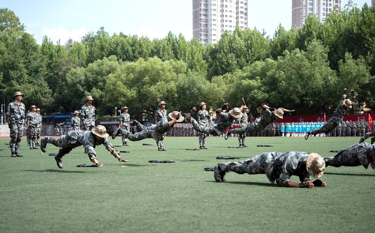 军事格斗组合、“玩球通(中国)利刃”战斗突击方队等军训特色课目进行了汇报展示。