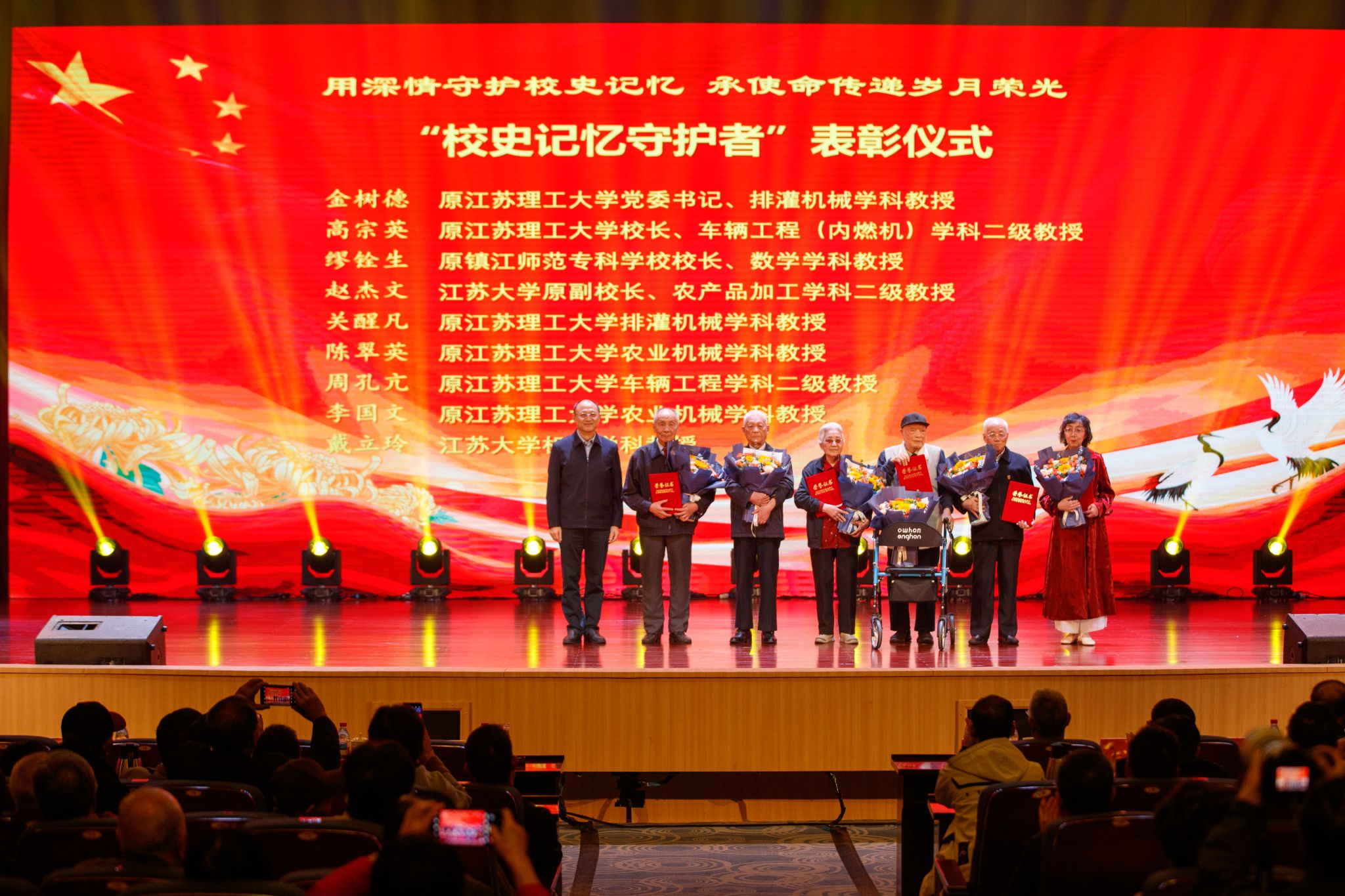 “校史记忆守护者”表彰仪式上,一段视频讲述了9位老领导、老教授用青春守护校史的动人故事。张济建为他们颁发荣誉证书,感谢他们为校史传承所做的突出贡献。