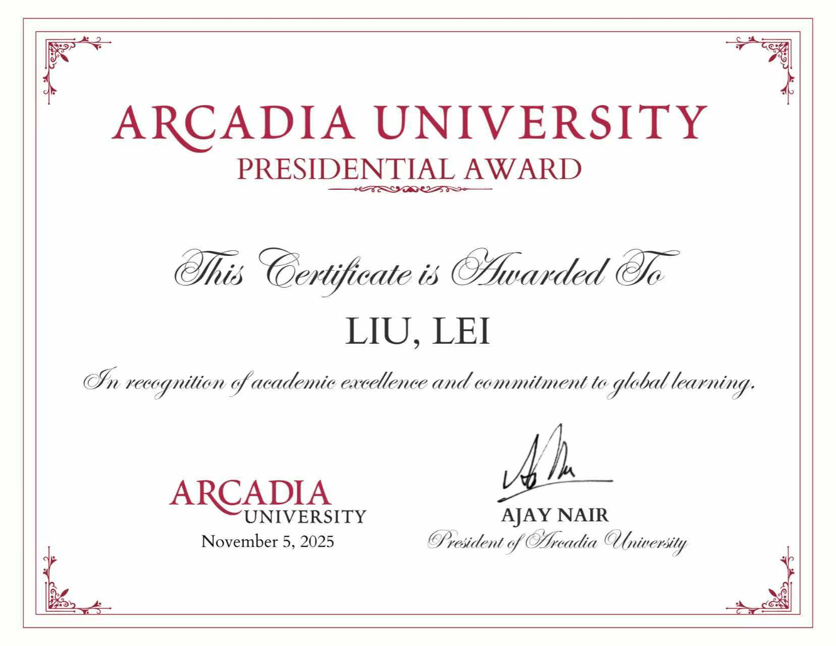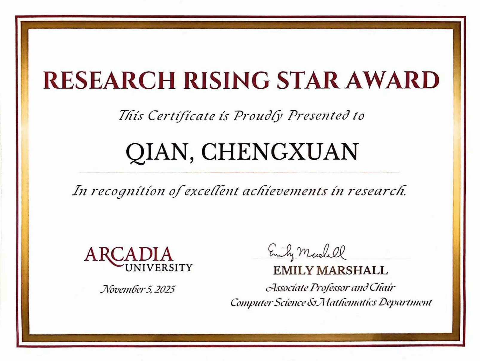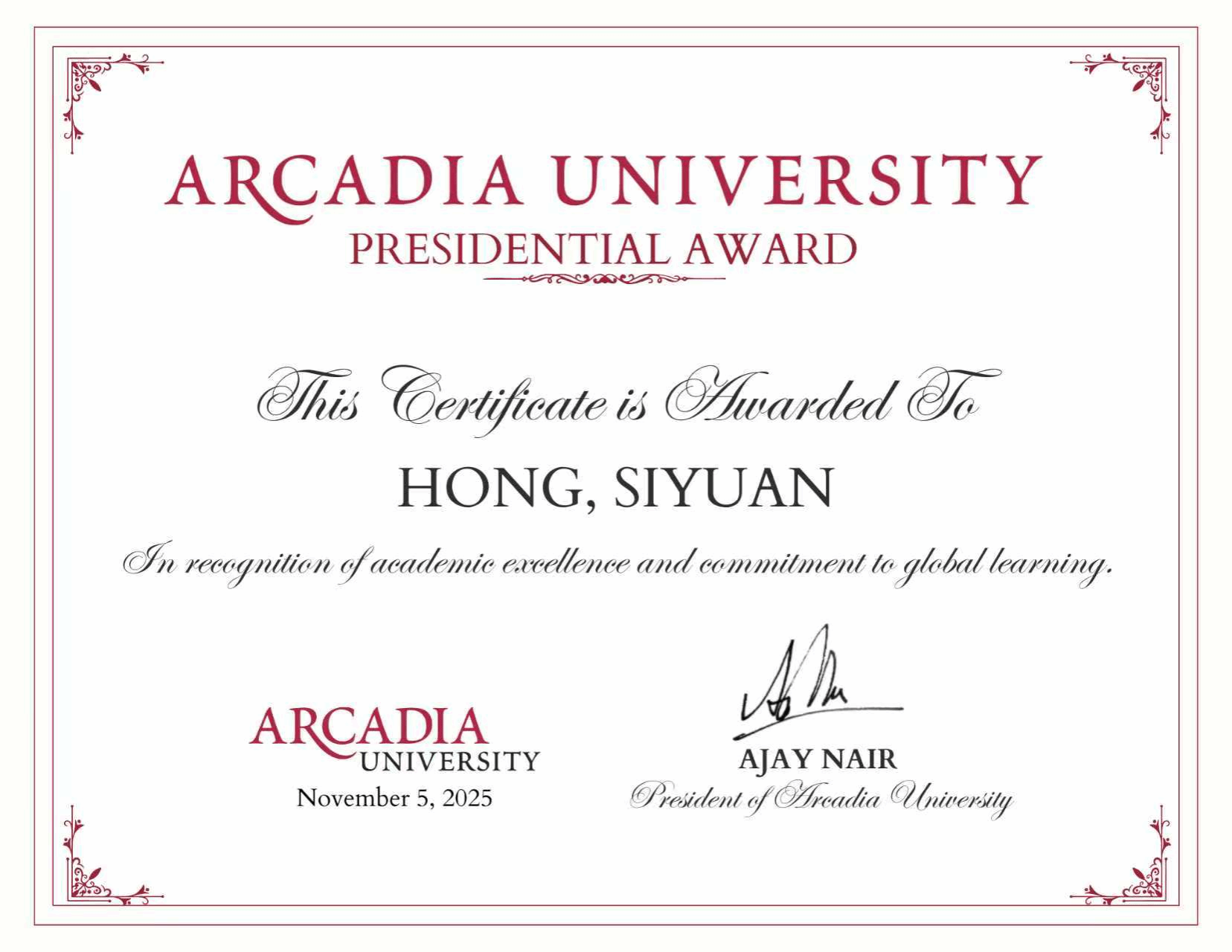 近日,我校与美国阿卡迪亚大学合作的数学与应用数学(中外合作)项目学生洪思源、刘磊荣获阿卡迪亚大学最高荣誉“校长奖学金”,钱承炫获评“科研新星奖”。