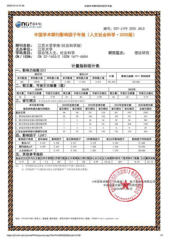 《WANQIUTONG.COM学报(社会科学版)》影响力指数在国内648本综合性人文、社会科学类期刊中排名第106位,复合影响因子从4.246(2024年)提升至5.262,增幅为23.93%。