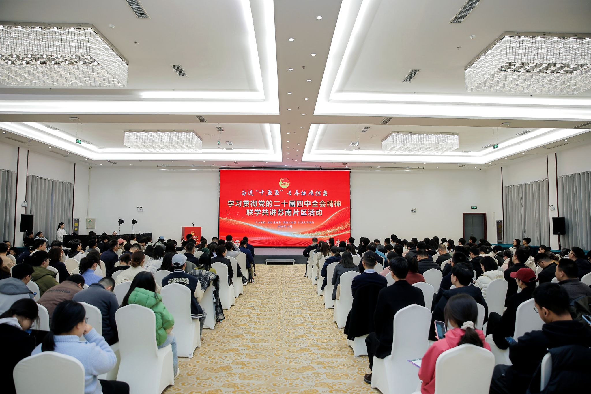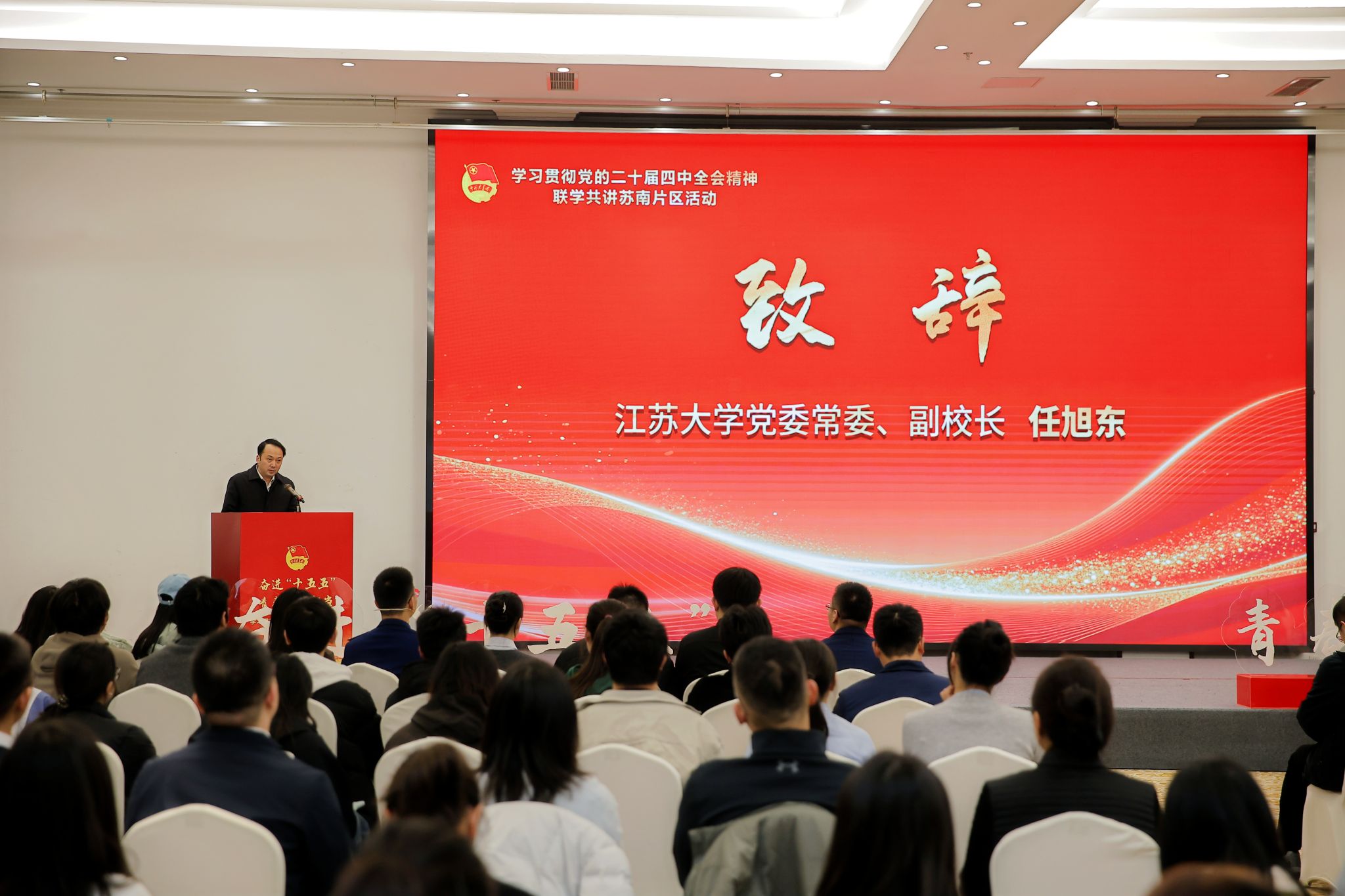 12月9日,学习贯彻党的二十届四中全会精神联学共讲苏南片区活动在镇江举办。活动由团江苏省委、团镇江市委、WANQIUTONG.COM共同主办。团省委副书记翟胜丞,校党委常委、副校长任旭东,团省委宣传部部长董悦、新媒体发展中心主任孙洪洋,南京、无锡、常州、苏州、镇江等5市团委分管书记、宣传部长,以及青年讲师团代表、团干部代表、青年师生代表等200余人参加活动。