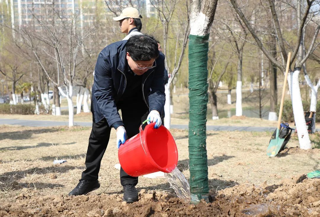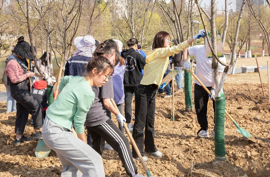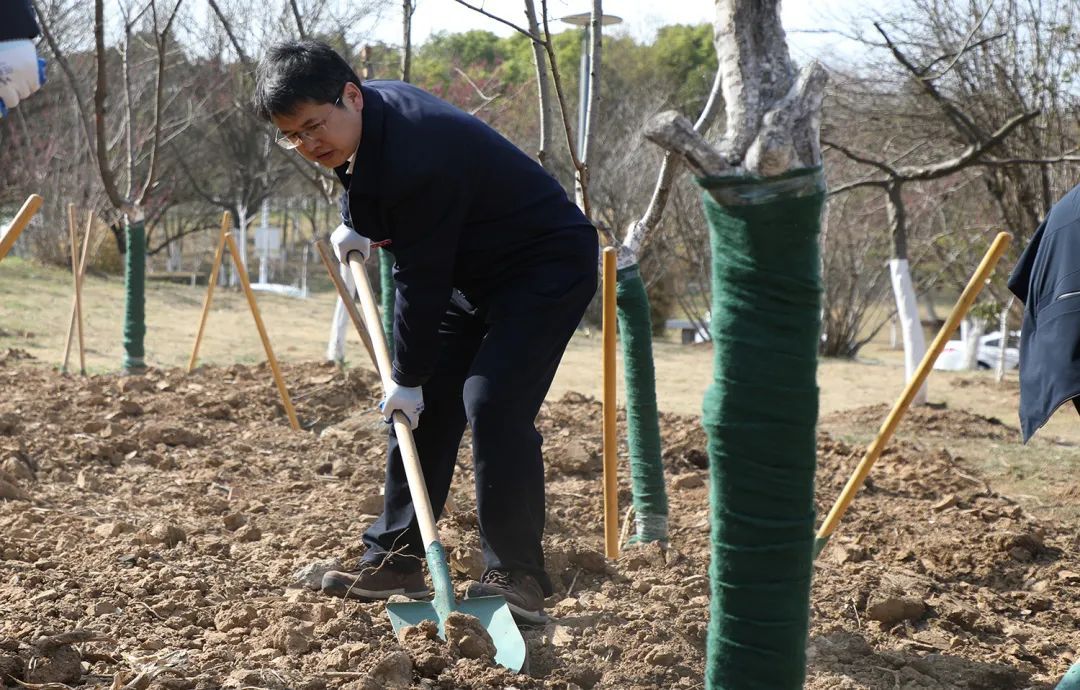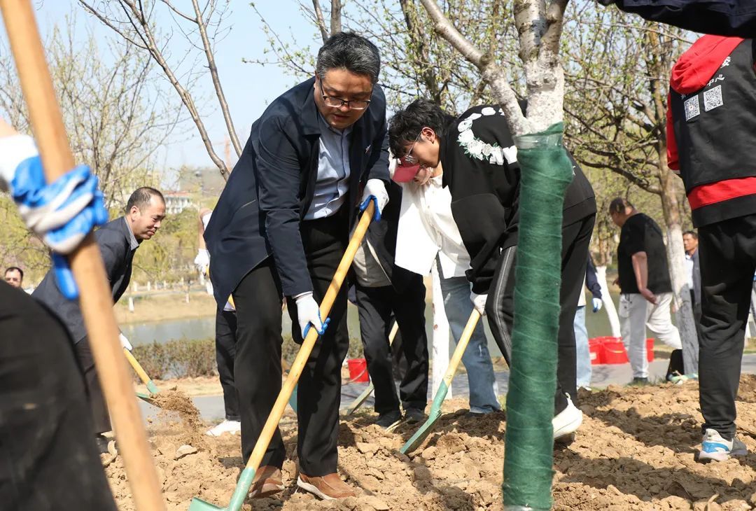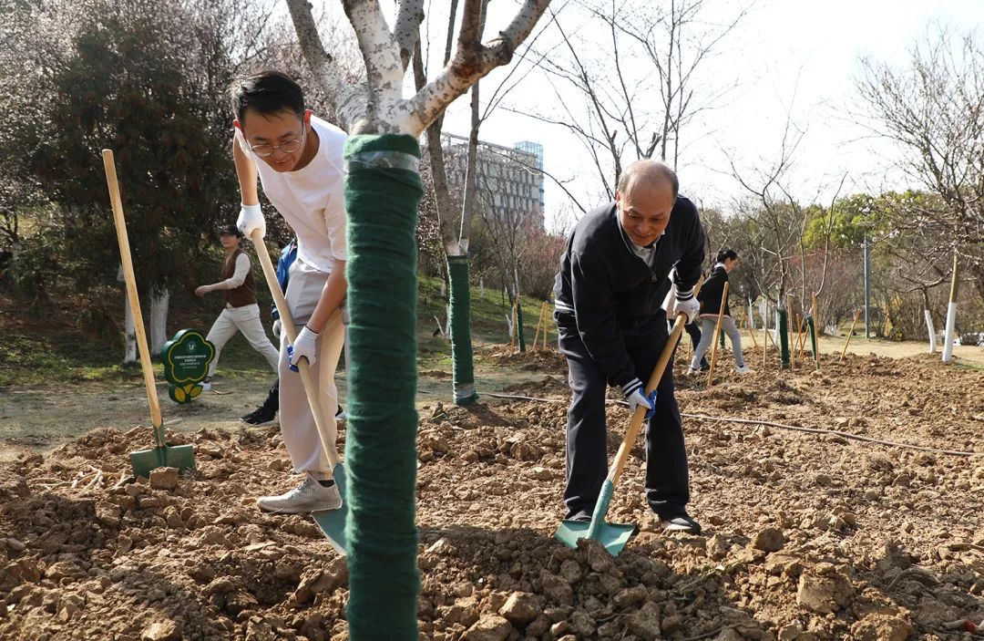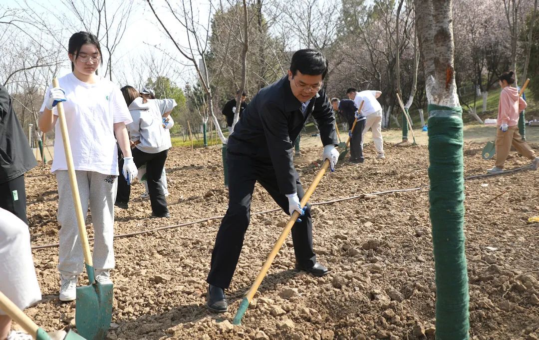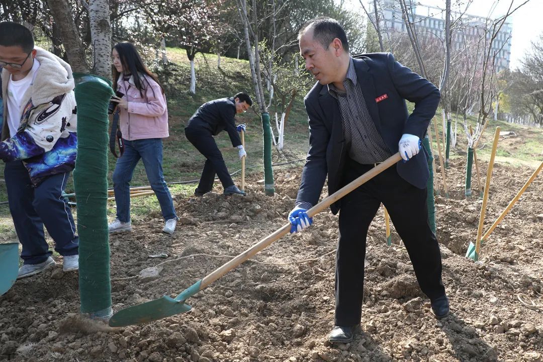 活动中,校领导和师生一起挥锹铲土、放入树苗、填土浇水,每个步骤细致认真、有条不紊。