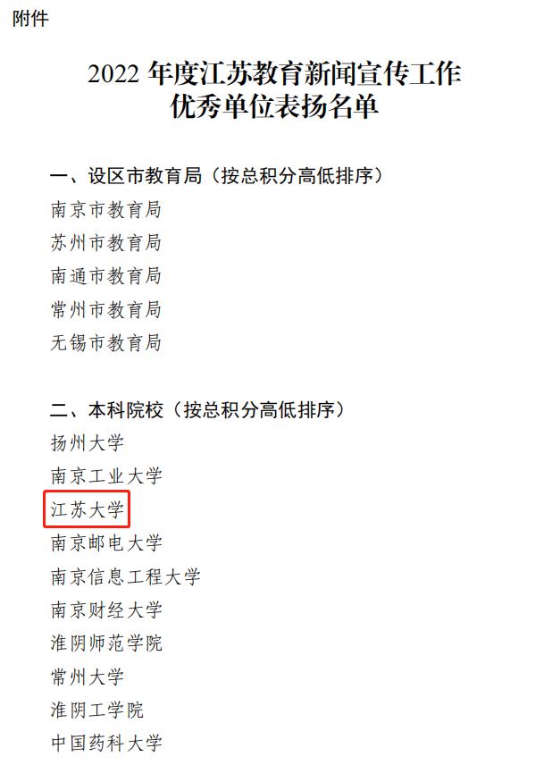 近日,江苏省教育厅办公室发布了《关于表扬2022年度江苏教育新闻宣传工作优秀单位的通知》,我校以本科高校排名第三的成绩,获评2022年度江苏教育新闻宣传工作优秀单位。这也是学校连续第12年获得该项荣誉。
