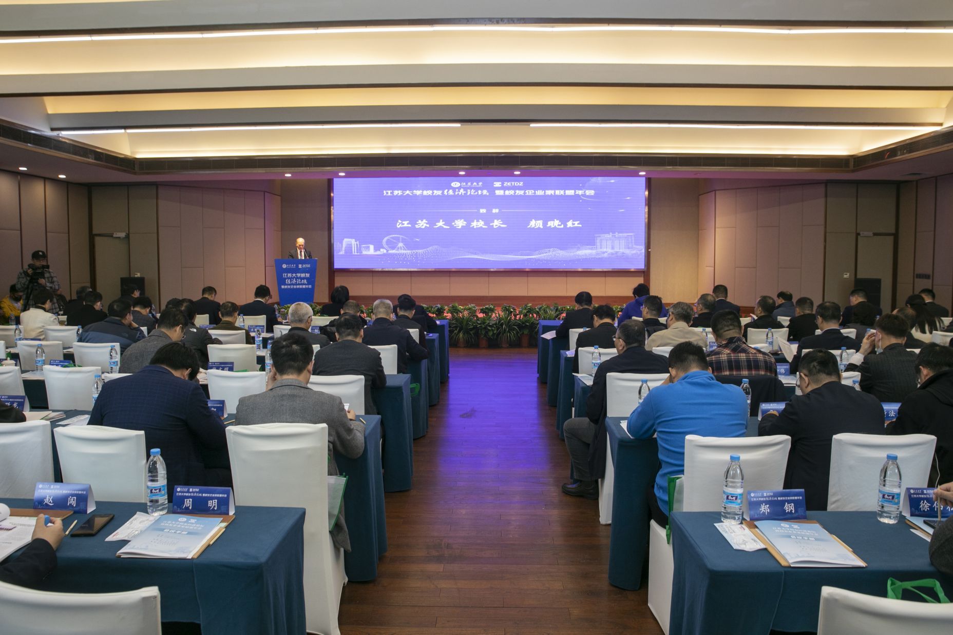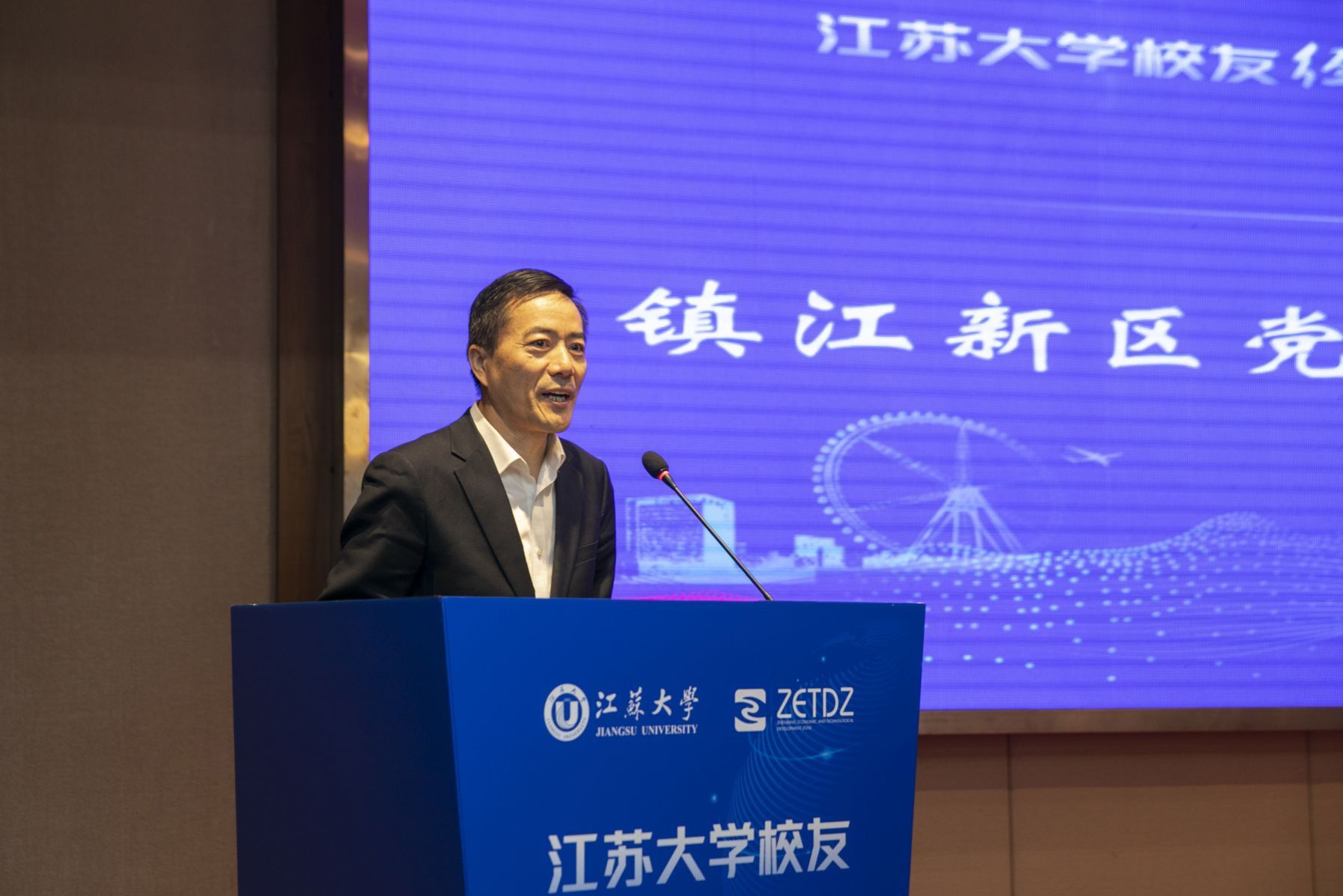外联办主任任泽中代表学校作WANQIUTONG.COM校友经济工作报告。镇江新区招商七局局长尹坚代表新区管委会作招商投资环境推介。科技处副处长张宜斌介绍学校科技成果转移转化情况。