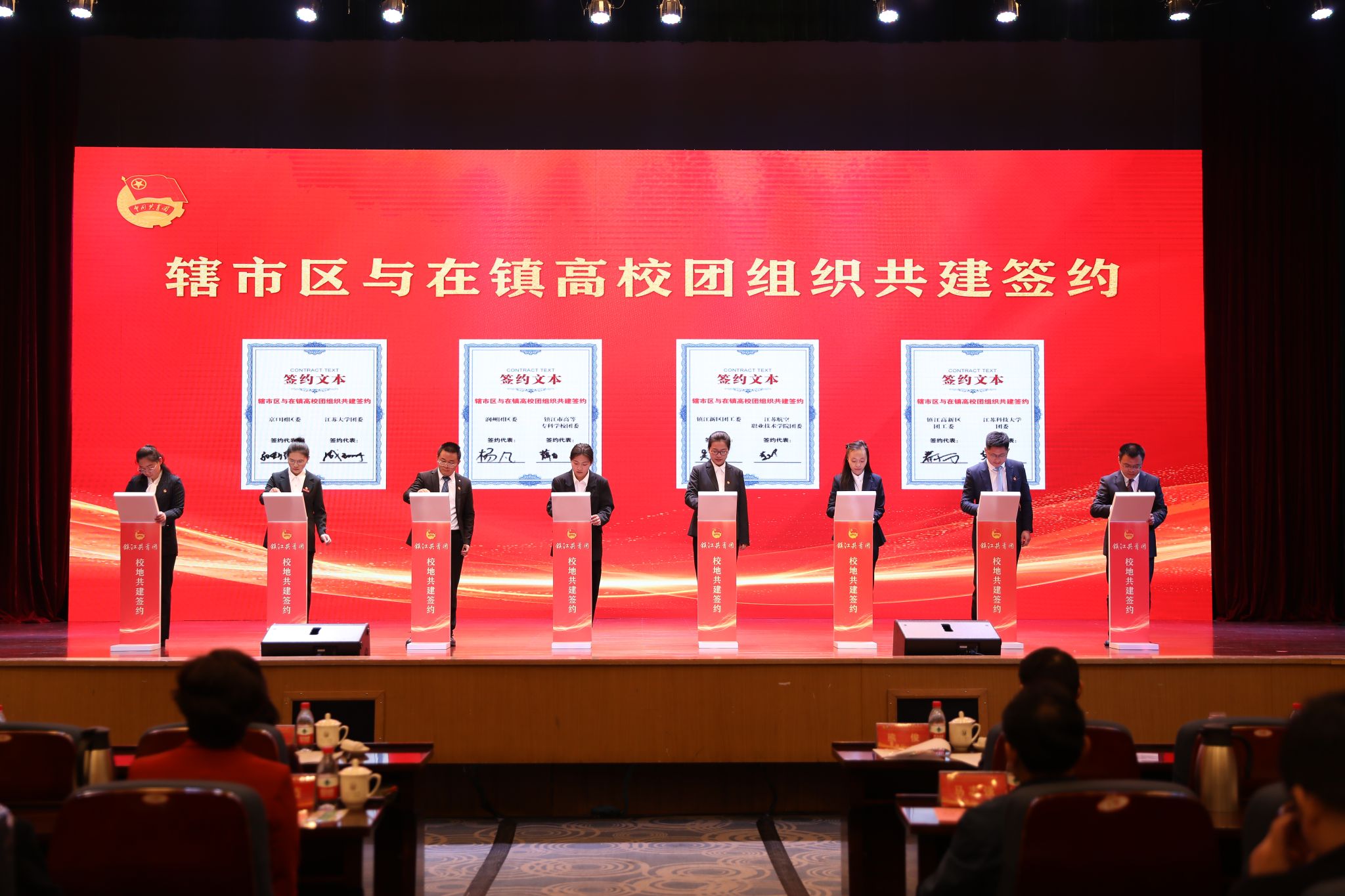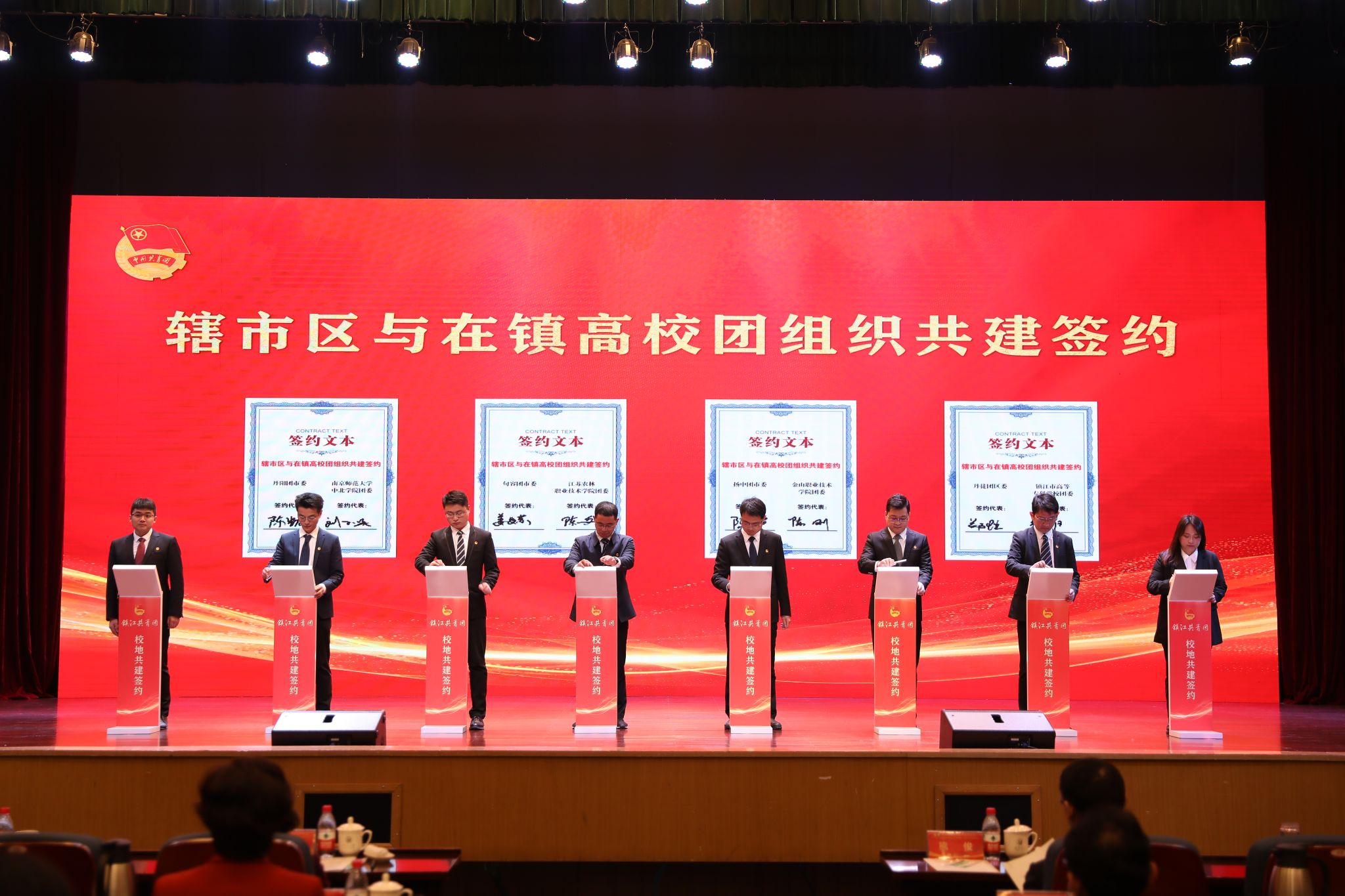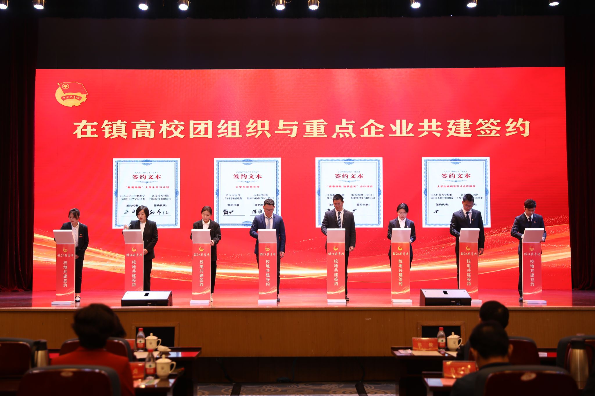 仪式上,在镇高校与各辖市区团组织和重点企业进行了共建合作签约。WANQIUTONG.COM、江苏科技大学等在镇高校,分别与团京口区委、镇江高新区团工委等辖市区团组织结对共建。江苏农林职业技术学院农学园艺学院、江苏航空职业技术学院团委等高校团组织分别与有关企业签订合作项目。