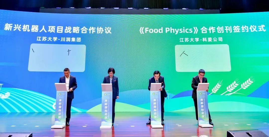 开幕式上,罗永忠、李红共同签署新兴机器人项目战略合作协议。蒋磊、副校长全力共同签署Food Physics合作办刊协议。