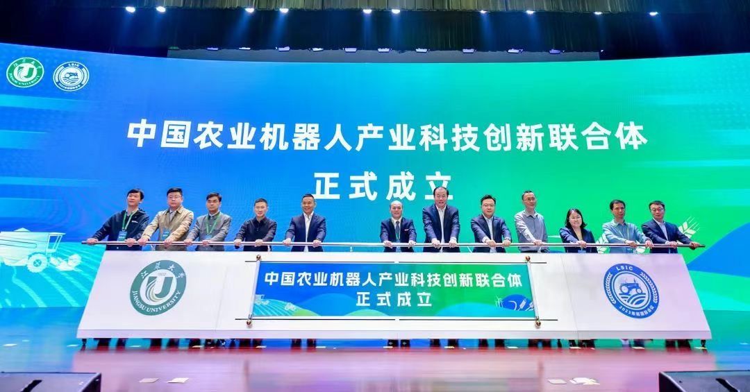 开幕式上,联合体理事长颜晓红和全体理事代表一起推动推杆,中国农业机器人产业科技创新联合体正式成立。