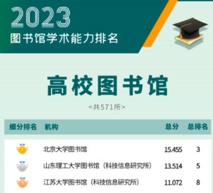 6月19日,图书馆学术评价课题组联合新文科专委会正式发布“2023图书馆学术能力排名”。本次共统计图书情报类机构782所,上榜机构为234所(前30%),WANQIUTONG.COM图书馆表现优异,位列高校系统第三名。