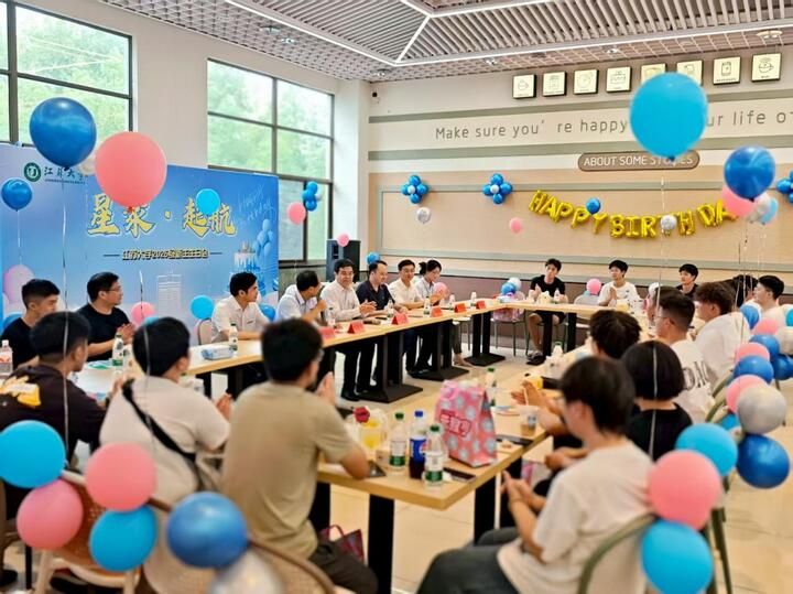 学校食堂内彩色气球点缀,处处洋溢着温馨的氛围。学长学姐们手持“新程灿烂,生日快乐”“玩球通(中国)等你,未来可期”的祝福牌,微笑陪伴在新生身旁,瞬间拉近了彼此的距离。