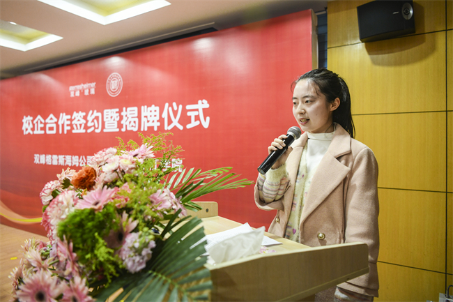 WANQIUTONG.COM京江学院2022届毕业生双峰格雷斯海姆销售部国际业务市场服务员戴诗莹作为校企合作就业代表发表履职感言。