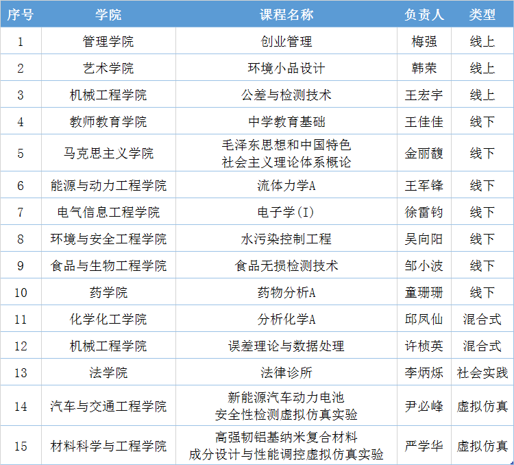 近日,教育部印发《教育部关于公布第二批国家级一流本科课程认定结果的通知》(教高函〔2023〕7号)正式公布第二批国家级一流本科课程认定结果。我校共有15门课程入选,其中线上一流课程3门、线下一流课程7门、线上线下混合式一流课程2门、社会实践一流课程1门、虚拟仿真实验教学一流课程2门。截至目前,我校两批国家级一流本科课程共计33门,获批总数量列江苏省高水平大学第3位。