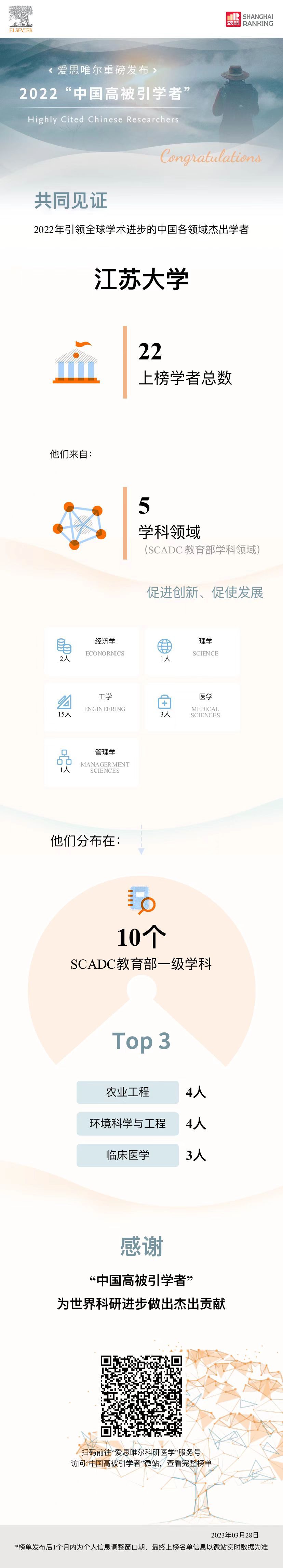 此次我校上榜人数并列中国内地高校第50位,涵盖10个一级学科。其中农业工程、环境科学与工程学科上榜人数最多,均为4人;机械工程、临床医学学科上榜人数均为3人。