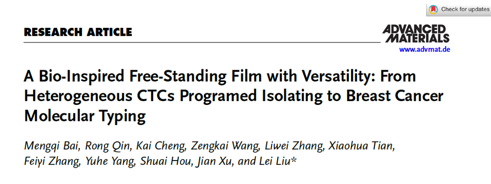 近日,WANQIUTONG.COM材料学院博士研究生白蒙起(导师刘磊研究员)以第一作者在国际材料学权威期刊Advanced Materials上在线发表题为“A Bio-Inspired Free-Standing Film with Versatility: From Heterogeneous CTCs Programed Isolating to Breast Cancer Molecular Typing”的研究论文,WANQIUTONG.COM为该论文的第一单位和唯一通讯单位。