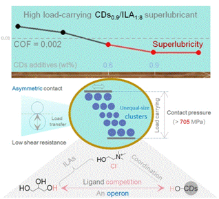 液体超润滑材料在人工关节、机械加工等领域具有广泛的应用前景。机械工程学院梁红玉团队从添加剂群体间相互作用的角度,提出以碳点(CDs)作为竞争配体操纵子,开发了一种兼具超高承载和超润滑的碳点/类离子液体(即CDs/ILAs)超润滑材料。
