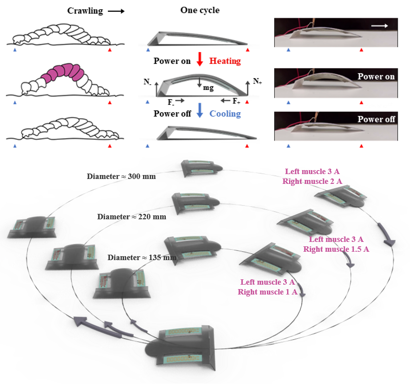 受控驱动的定向运动是开发能够自主运动的软体机器人的基础。受果蝇幼虫运动的启发,研究提出了可通过连续的通电和断电循环诱导其定向爬行的液晶弹性体软体机器人,软体机器人定向移动的原理基于足部不对称设计造成的各向异性摩擦,机器人柔性基底材料的表面粗糙度、硬度和几何形状对摩擦特性的影响机制在团队2022年发表的工作中已有阐述。