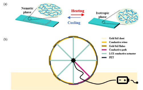 智能材料变形驱动是集材料、力学、生物学等多学科的交叉前沿研究热点。液晶弹性体(Liquid crystal elastomers,LCEs) 作为能够产生大的可逆驱动应变的智能柔性弹性体材料,通过设计含有各向异性刚性介晶单元的聚合物网络结构,在外界刺激下(光、热、电等) 使其达到相转变温度时,引发由液晶态(有序)向各向同性态(无序)转变的链段运动,进而表现为宏观结构程序化变形。液晶弹性体材料类似于自然界生物体在多种外界刺激下自我调节的特性,在开发智能仿生设备和构建软体机器人系统中拥有巨大的应用前景。基于液晶弹性体辐条的非对称收缩,可直接从稳定的外部电源获取能量以维持软体机器人的连续旋转运动,这一设计理念有望启发其他软体机器人智能材料与智能结构的多元集成,代表着自主运动的软体机器人设计向前迈进了可喜的一步。
