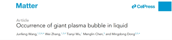 我校能源与动力工程学院王军锋教授团队与丹麦奥胡斯大学跨学科纳米科学中心董明东教授团队合作,在Cell出版社国际顶刊《物质》Matter上发表了题为“Occurrence of giant plasma bubble in liquid”的最新研究成果,并被推荐为期刊封面论文。王军锋是第一作者兼通讯作者,董明东是共同通讯作者,张伟博士后是共同第一作者。