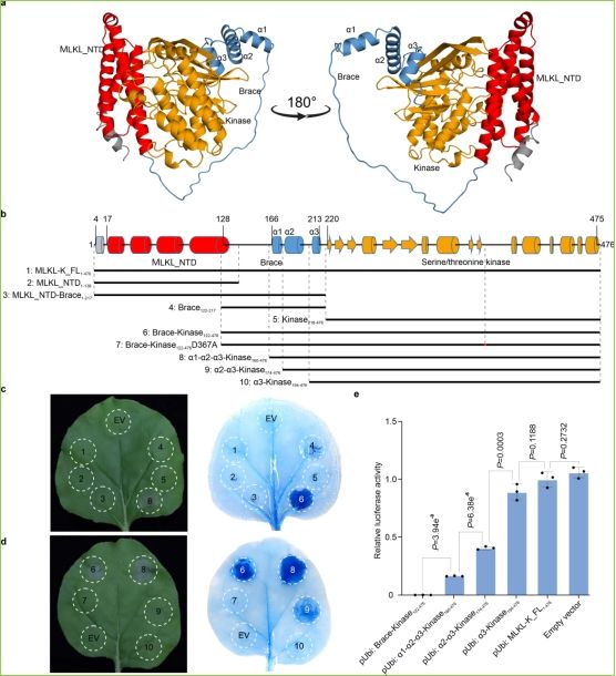 Pm13编码的激酶融合蛋白具有特殊的结构,在N端含有一个混合谱系激酶结构域样蛋白(MLKL_NTD)结构域,在C端含有一个丝氨酸/苏氨酸激酶结构域,两者中间有一段含3个α螺旋的衔接序列(Brace)。烟草叶片和小麦叶片原生质体瞬时表达分析发现,融合片段Brace-Kinase122 -476能够诱导细胞死亡,而全长蛋白和单独的结构域/区段(MLKL_NTD、Brace和Kinase)都不能诱导细胞死亡。该结果表明,Pm13介导的白粉病抗性依赖于功能性的激酶结构域和邻近激酶结构域的Brace区域的3个α螺旋,但在没有病原菌的情况下,激酶融合蛋白处于失活的自抑制状态。在动物和拟南芥中,MLKL蛋白是假激酶,细胞死亡活性由MLKL_NTD结构域或MLKL-Brace融合片段介导,与之相比,Pm13编码的MLKL-K是真激酶,其生化功能具有独特性。
