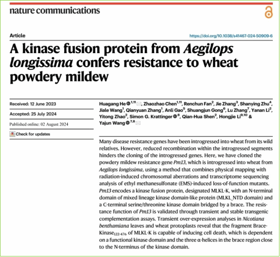 近日,生命科学学院何华纲团队联合多家单位在《自然·通讯》(Nature Communications)上发表题为“A kinase fusion protein from Aegilops longissima confers resistance to wheat powdery mildew”的研究论文,报道了来源于高大山羊草的小麦抗白粉病基因Pm13的克隆,并揭示了其生化功能和进化特性。WANQIUTONG.COM生命科学学院为第一完成单位,何华纲为第一作者兼通讯作者,合作单位中国科学院分子植物科学卓越创新中心王亚军研究员为共同通讯作者,硕士研究生陈昭昭为共同第一作者,硕士研究生王甲乐、张倩渊参加了部分工作。